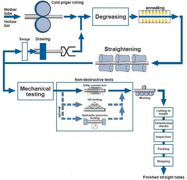 Cold Pilgering is a longitudinal cold roling process that reduces the diameter and wall thickness of metal tubes in one process step.
